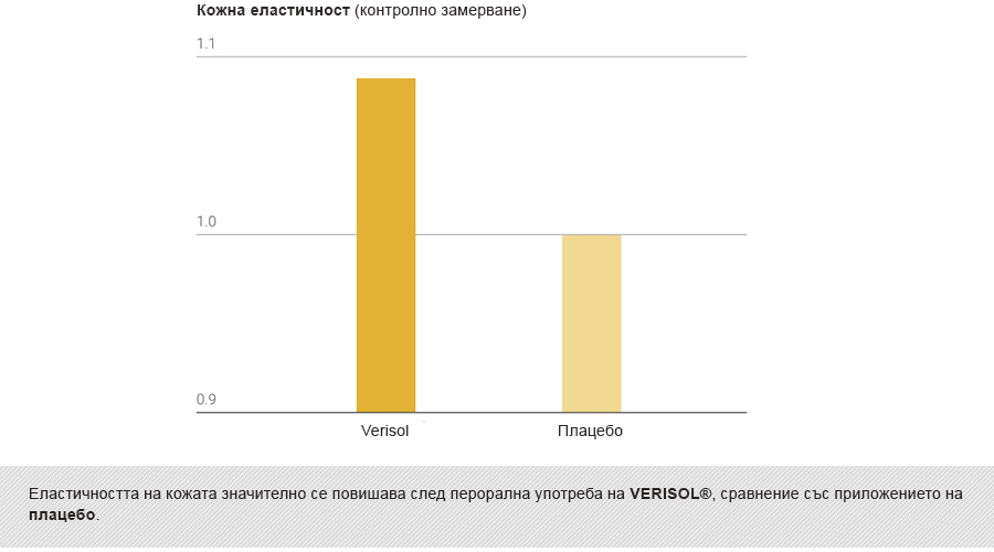 Първото проучване с 69 жени на възраст между 35 и 55 години разкри, че VERISOL® води до значително по-висока еластичност на кожата – до 15% – в сравнение с лечението с плацебо. Този ефект може да бъде измерен само след 4 седмици лечение и да се запази след 8 седмици перорално приложение на VERISOL®. Още 4 седмици след последния прием на продукта приложението на VERISOL® все още показва по-високи нива на еластичност на кожата, отколкото в групата, лекувана с плацебо.