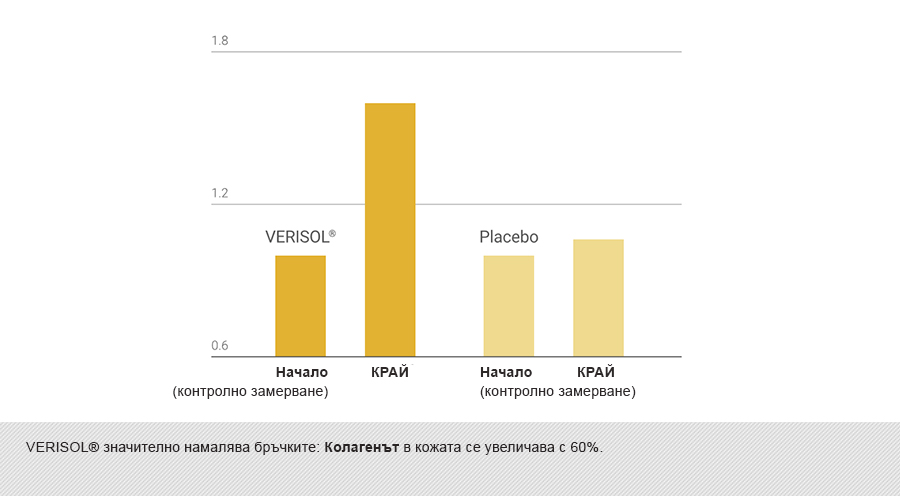 Второто проучване с повече от 100 жени на възраст между 45 и 65 години показва, че пероралното приложение на VERISOL® (2,5 g / ден) значително намалява бръчките след 4 седмици и води до значително по-висока концентрация на проколаген в кожата.