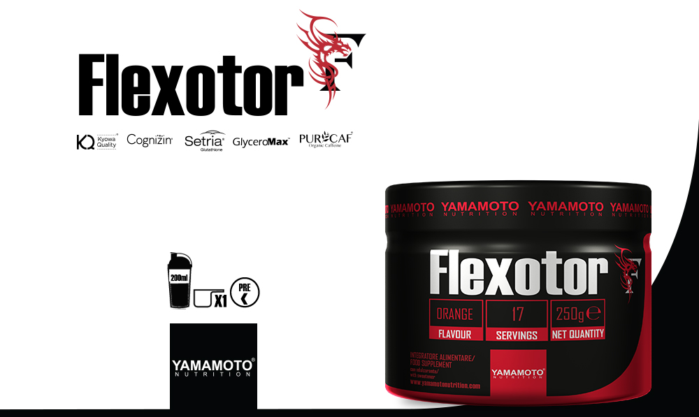 От постоянните научни изследвания на Yamamoto ® Nutrition идва Flexotor ®, добавка, специално предназначена да направи всяка тренировъчна цел насочена към мускулна стимулация, действаща по-специално на три фронта: енергийно-когнитивна, на мощна и продължителна стимулация на азотен оксид, позволявайки мускулната клетка да остане хидратирана по време и след тренировка.
