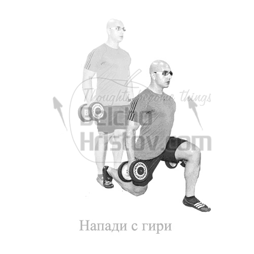 Застанете прави с поглед само и единствено гледащ напред. Издишвайте въздуха на всеки напад напред, а прибирайки крака, поемайте въздух. Дръжте дъмбелите встрани тялото, ръцете са отпуснати, не ги люлейте.