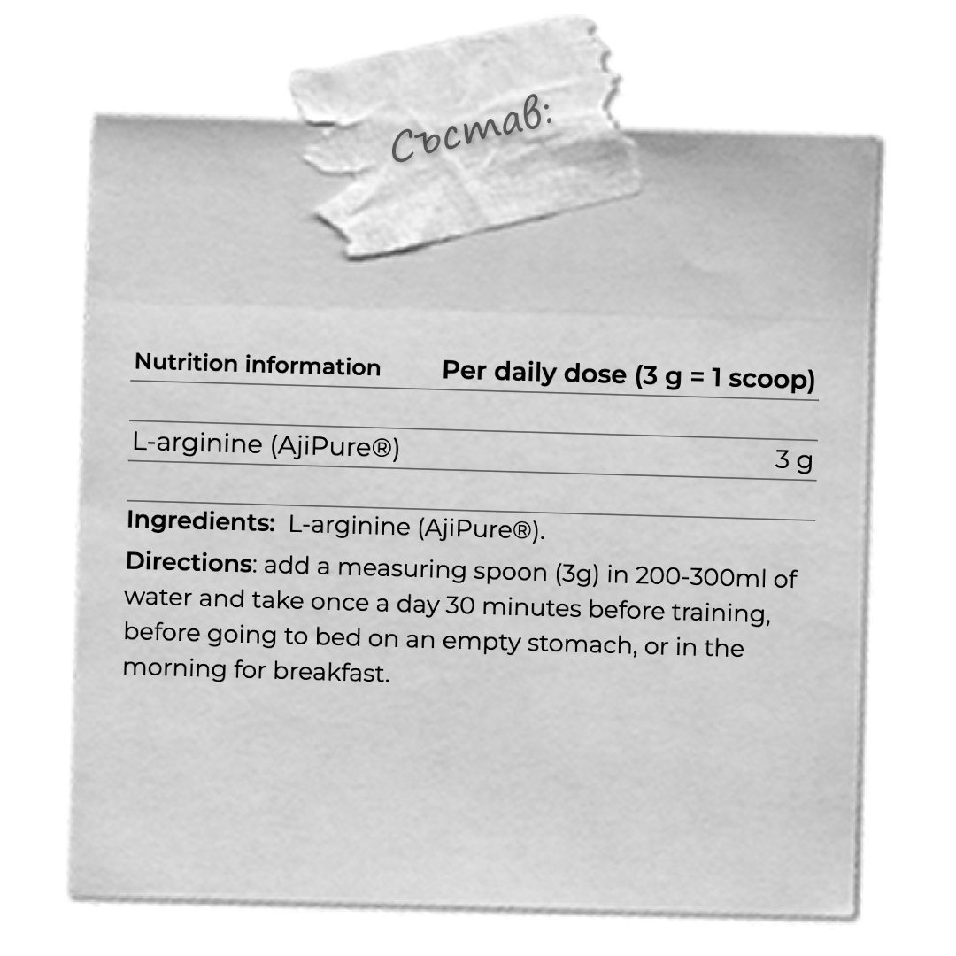 СЪСТАВКИ В ПРЕПОРЪЧИТЕЛНАТА ДНЕВНА ДОЗА: СЪДЪРЖАНИЕ НА АКТИВНИЯ СЪСТАВ ВЪВ ДОЗА: (3 ГРАМА) Л-аргинин (AjiPure®) – 3 00 мг |