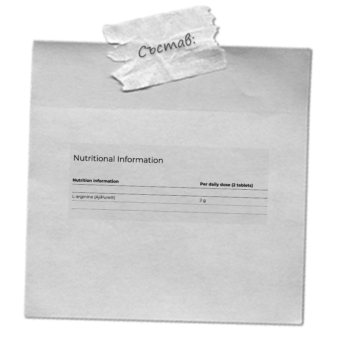 СЪСТАВКИ В ПРЕПОРЪЧИТЕЛНАТА ДНЕВНА ДОЗА: СЪДЪРЖАНИЕ НА АКТИВНИЯ СЪСТАВ ВЪВ ДОЗА: (2 ТАБЛЕТКИ) Л-аргинин AjiPure ® – 2 грама |