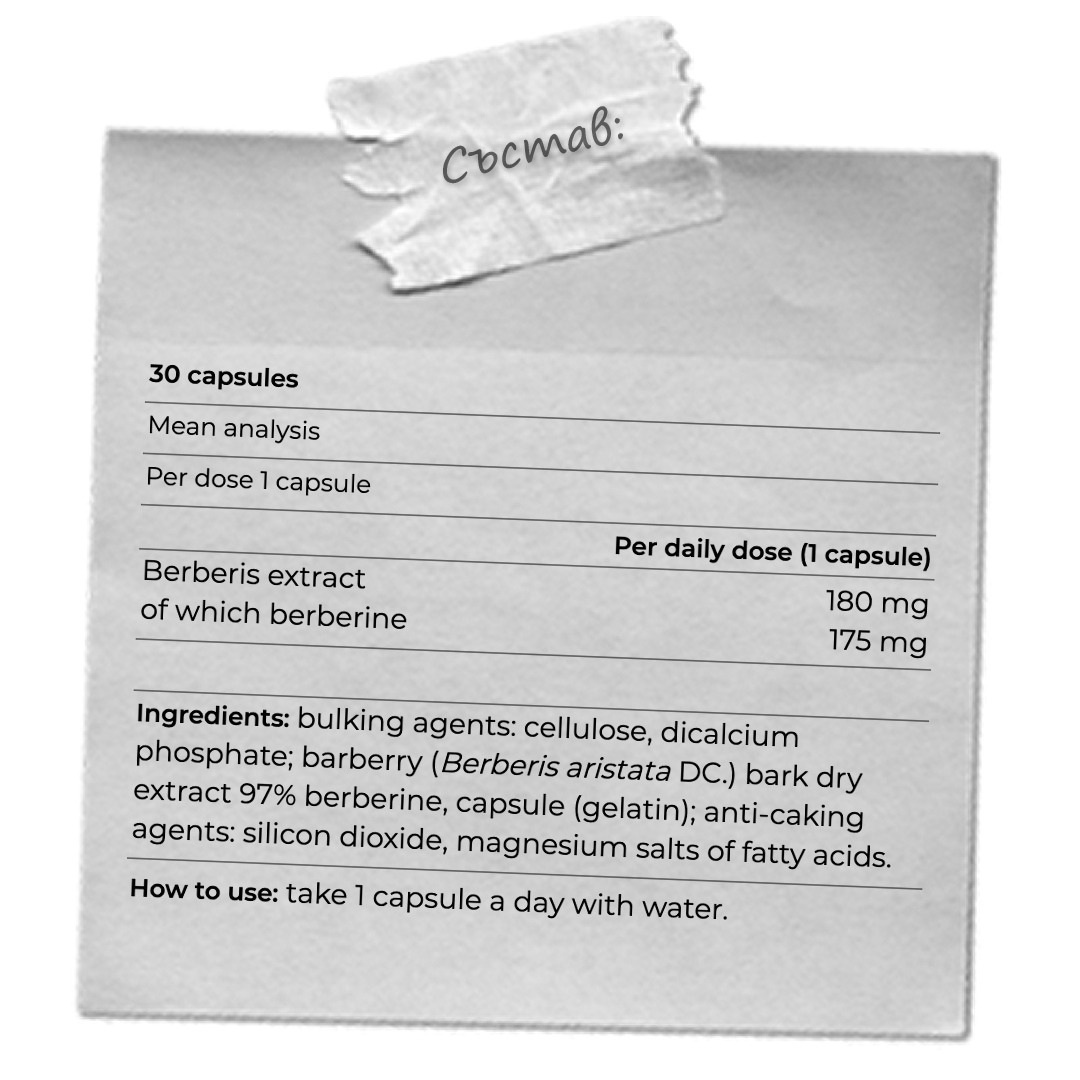 СЪСТАВКИ В ПРЕПОРЪЧИТЕЛНАТА ДНЕВНА ДОЗА: СЪДЪРЖАНИЕ НА АКТИВНИЯ СЪСТАВ ВЪВ ДОЗА: (1 КАПСУЛА) Берберин екстракт – 180 мг от който берберин – 175 мг |