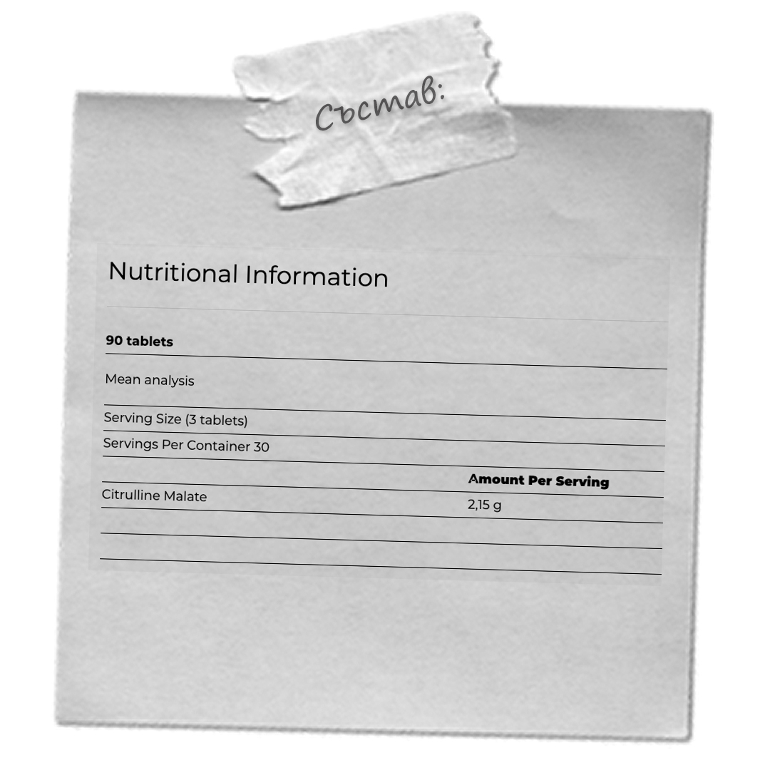 СЪСТАВКИ В ПРЕПОРЪЧИТЕЛНАТА ДНЕВНА ДОЗА: СЪДЪРЖАНИЕ НА АКТИВНИЯ СЪСТАВ ВЪВ ДОЗА: (3 ТАБЛЕТКИ) Цитрулин малат – 3 000 мг |