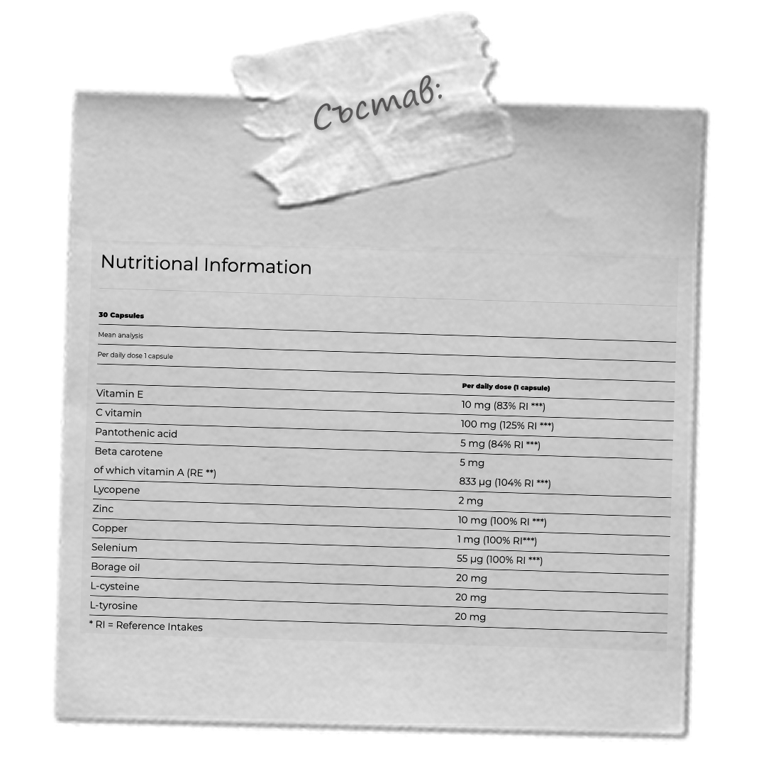 СЪСТАВКИ В ПРЕПОРЪЧИТЕЛНАТА ДНЕВНА ДОЗА: СЪДЪРЖАНИЕ НА АКТИВНИЯ СЪСТАВ ВЪВ ДОЗА: (1 КАПСУЛА) Витамин Е – 10 мг (83% от реф. прием) Витамин Ц – 100 мг (125% от реф. прием) Пантотенова киселина – 5 мг (84% от реф. прием) Бета каротен – 5 мг от който витамин А – 863 мцг (104% от реф. прием) Ликопен – 2 мг Цинк – 10 мг (100% от реф. прием) Мед – 1 мг (100% от реф. прием) Селен – 5 мцг (100% от реф. прием) Боридж масло – 20 мг Л-цистеин – 20 мг Л-тирозин – 20 мг * RI = Референтни количества |