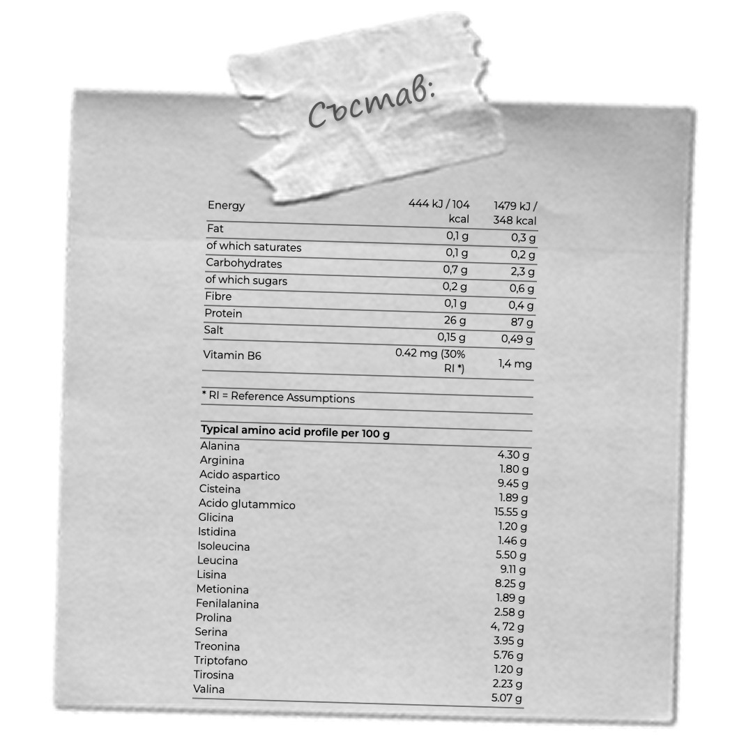 СЪСТАВКИ В ПРЕПОРЪЧИТЕЛНАТА ДНЕВНА ДОЗА: СЪДЪРЖАНИЕ НА АКТИВНИЯ СЪСТАВ ВЪВ ДОЗА: (30 ГРАМА) Енергийна стойност – 104 ккал Мазнини – 0.1 гр от които сатурирани – 0.1 гр Въглехидрати – 0.7 гр захари – 0.2 гр Фибри – 0.1 гр Протеин – 26 гр Соли – 0.15 гр Витамин Б-6 – 0.42 мг (30% от дневната стойност) Състав на амино профил в 100 грама: Аланин – 4.3 гр Аргинин – 1.8 гр Аспартамова киселина – 9.45 гр Цистеин – 1.89 гр Глутаминова киселина – 15.55 гр Глицин – 1.20 гр Хистидин – 1.46 гр Изолевцин – 5.5 гр Левцин – 9.11 гр Лизин – 8.25 гр Метионин – 1.89 гр Фенилаланин – 2.58 гр Пролин – 4.72 гр Серин – 3.95 гр Треонин – 5.76 гр Триптофан – 1.2 гр Тирозин – 2.23 гр Валин – 5.07 гр |