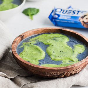Добавете овеса, подхранващият протеин, содата за хляб, индийското орехче и канелата към миксер каната ви и блендирайте докато сместа с продукти започне да заприличва на фино тесто. Добавете всички останали съставки освен шоколадовите парченца и обработете до гладка и кремообразна смес.